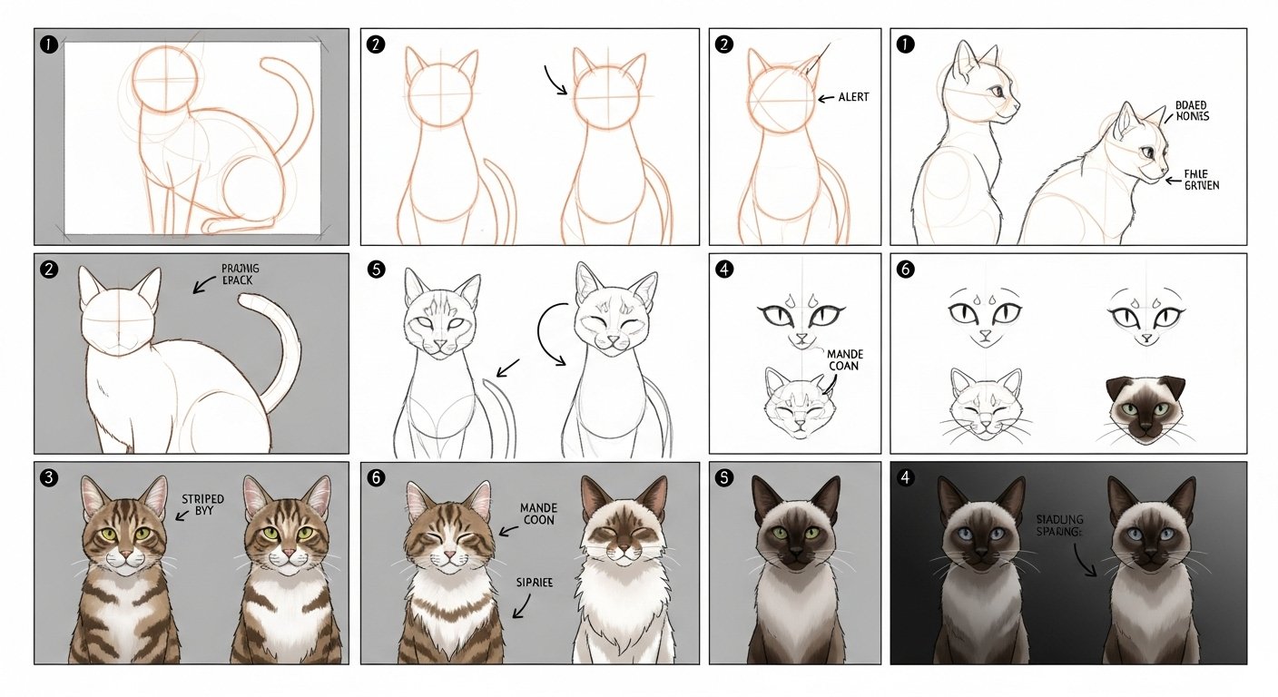 Are your little ones obsessed with cats? Whether they have a furry friend at home or just love watching cat videos, drawing cats is a fun way to spark their creativity! These 12 simple tutorials are designed for kids, using basic shapes like circles, ovals, and lines. No fancy art skills needed—just grab some paper, pencils, crayons, and let’s get drawing. Each tutorial includes step-by-step instructions and a helpful visual guide. Perfect for rainy days, family art time, or even classroom activities. Let’s dive in and create some purr-fect masterpieces!