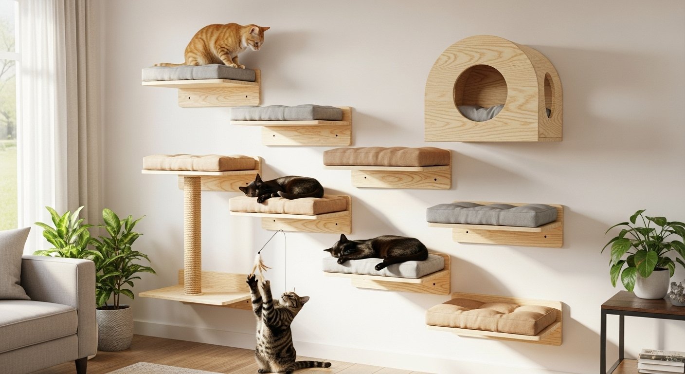 Staggered floating shelves create a vertical path for leaping. Clean lines and colors add modern style.