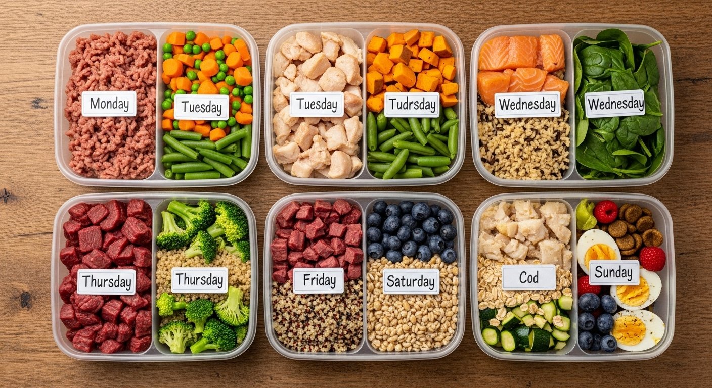 Preparing a weekly meal prep for your dog can be a rewarding way to ensure they’re getting fresh, nutrient-rich food tailored to their needs. This guide draws from veterinary-approved sources to provide a balanced 7-day plan, emphasizing safety, variety, and ease. Remember, while homemade diets offer benefits like fresher ingredients and customization, they must be nutritionally complete to avoid deficiencies—always consult your veterinarian or a board-certified veterinary nutritionist before starting, especially for puppies, seniors, or dogs with health conditions.