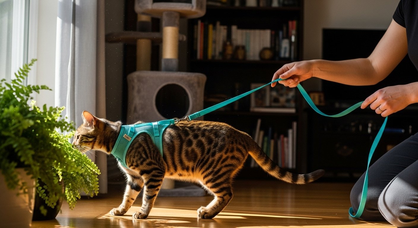 - Indoor Walking Practice: Walk around the house, letting the cat lead but guiding gently. Keep sessions fun with play.